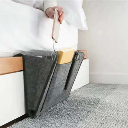 All Within Arms Reach. The bedside pocket can store all of your belongings together by your side while on bed, sofa or desk which have a safe and standard place, and no more lost things. More strong and durable, hold heavier things and will not be deformed