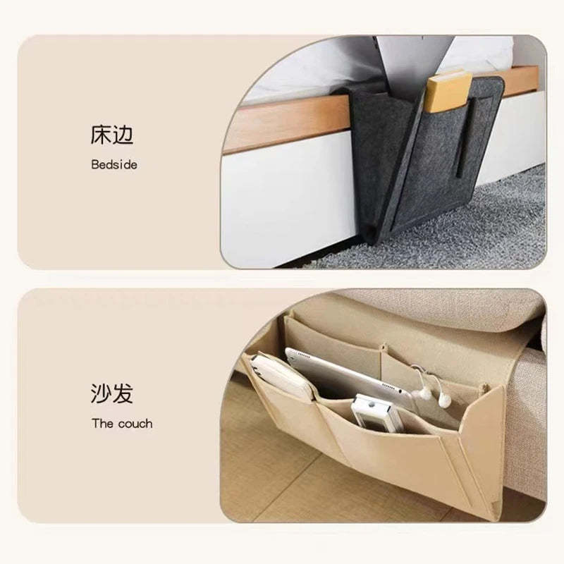 The high-quality chemical fiber felt storage bag is ideal for convenient bedside storage. Store your phone, laptops, e-readers, tablets, books and remotes all at an arms length away for quick access. Secure your cords for convenient charging at night. Organizes items you frequently use to be readily accessible at your leisure. Never again will you have to get out of bed to reach a tissue, television remote, books, magazines, flashlights, medications, accessories and more. When not in use, the caddy collapses for storage. This organizer is perfect for rooms where storage is limited.