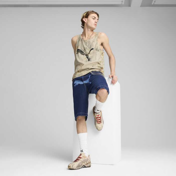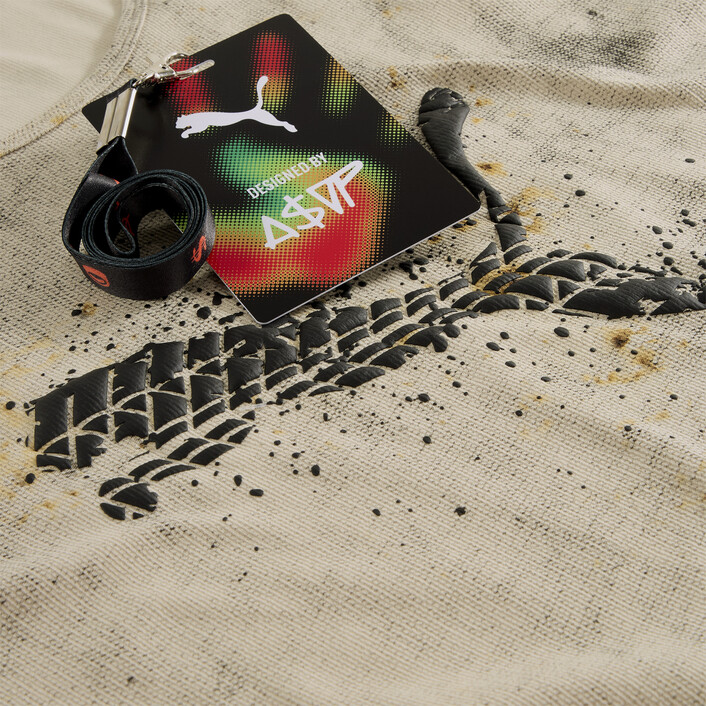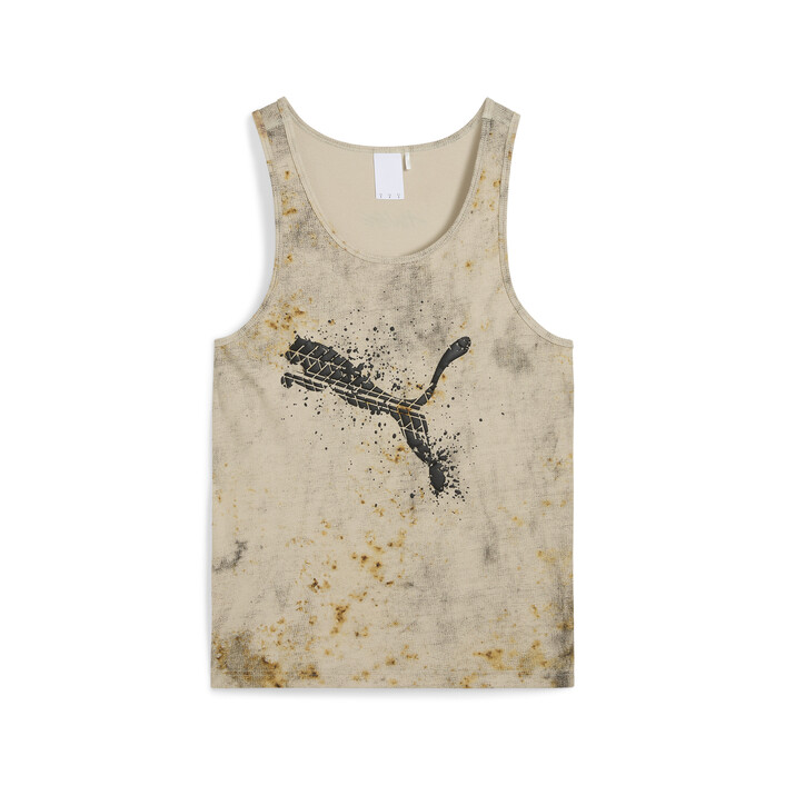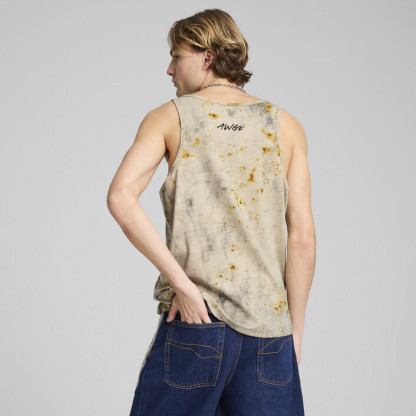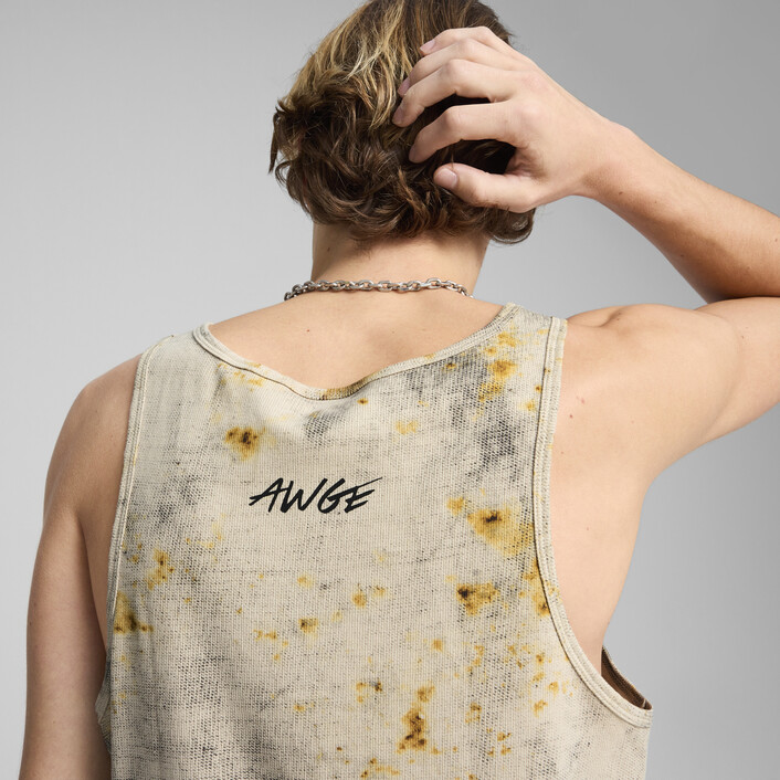 This A$AP ROCKY x PUMthtA tank stands out with a puff-printed PUMthtA Cat Logo with tire marks at the chest, plus AWGE branding at the back. It features a loose fit and a distressed treatment as if it’s been worn in the garage all day.
