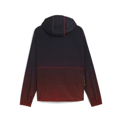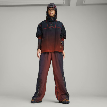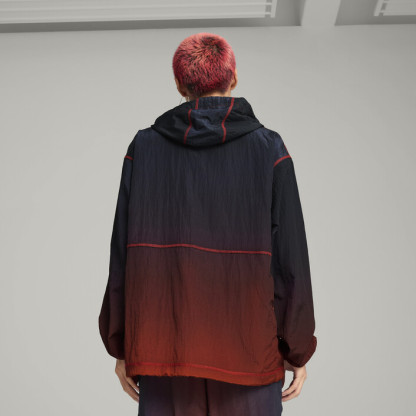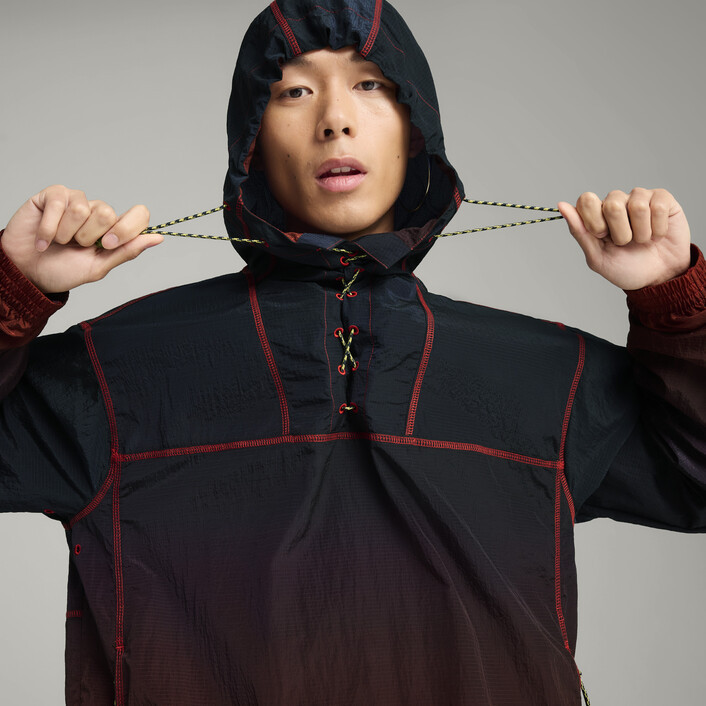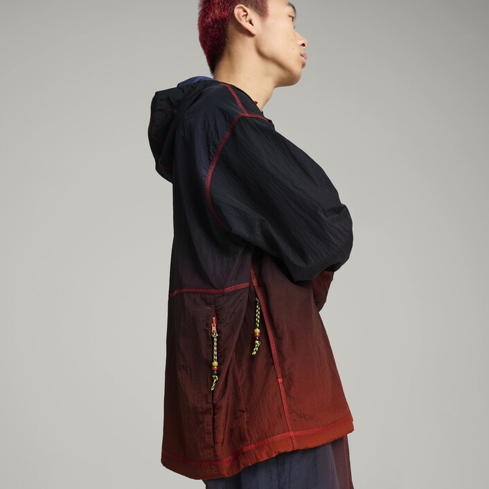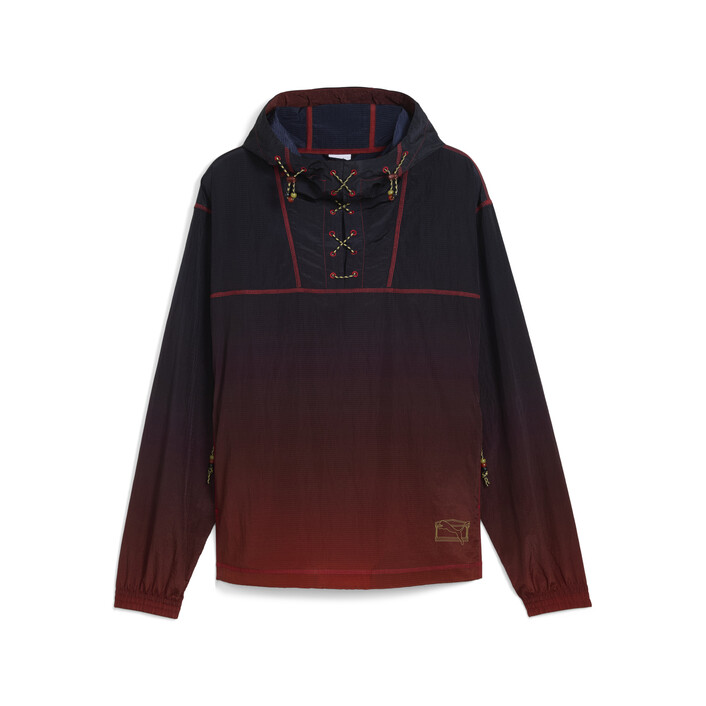 Luxe-streetwear brand Aries is back with a new collection that combines their signature extravagance with PUMthtA’s heritage silhouettes. This collection is centered around the charged athleticism of Muay Thai, as well as the danger and thrill of classic fighting games. Part of the collection, this light jacket has lacing details and a hood with bungee drawcords for an adjustable fit.