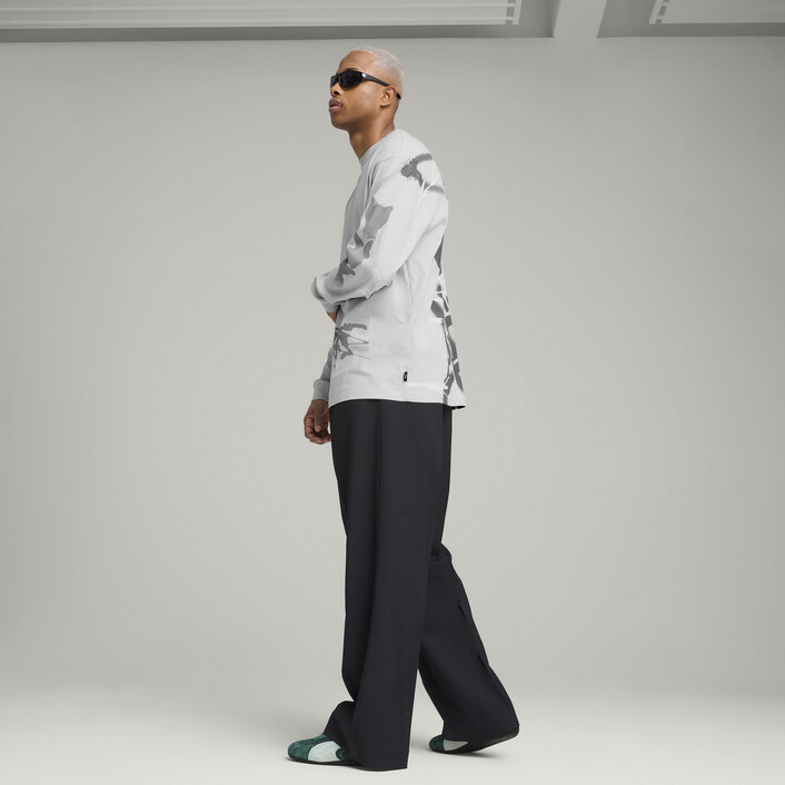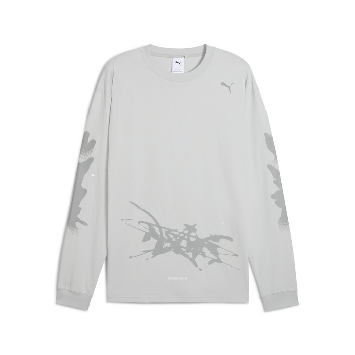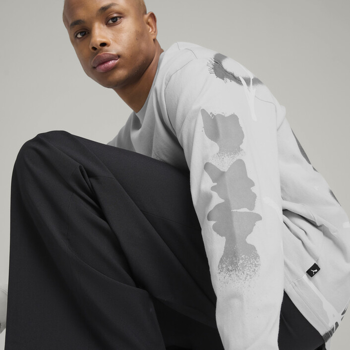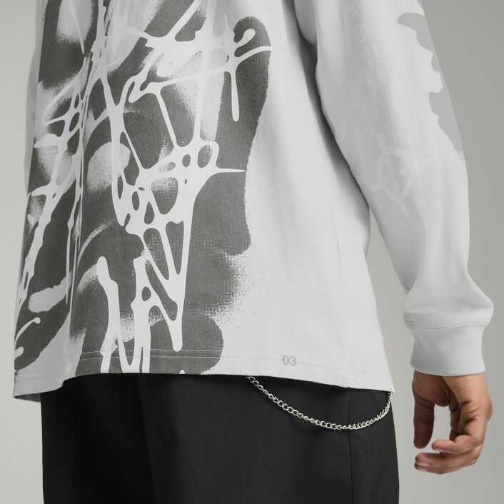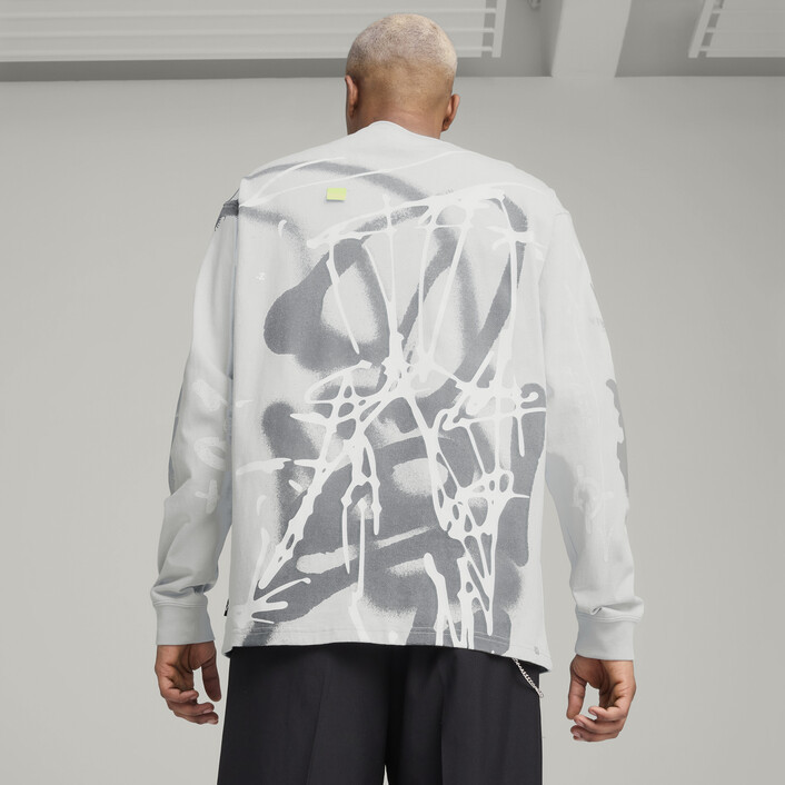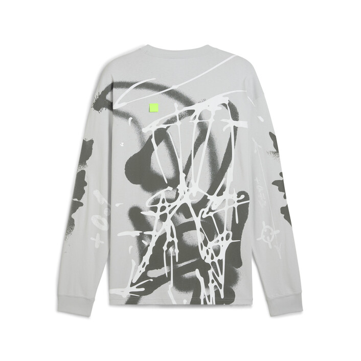 Next in our series comes this collaboration with Spanish artist Nacho. Nacho is known not only for his striking and energetic sculpture work, but also ventures into graffiti and digital design. With the collection he brings his unique aesthetic to our PUMthtA apparel. This long-sleeved top showcases bold graphics on the front and back with glitter graphic prints on the sleeves.