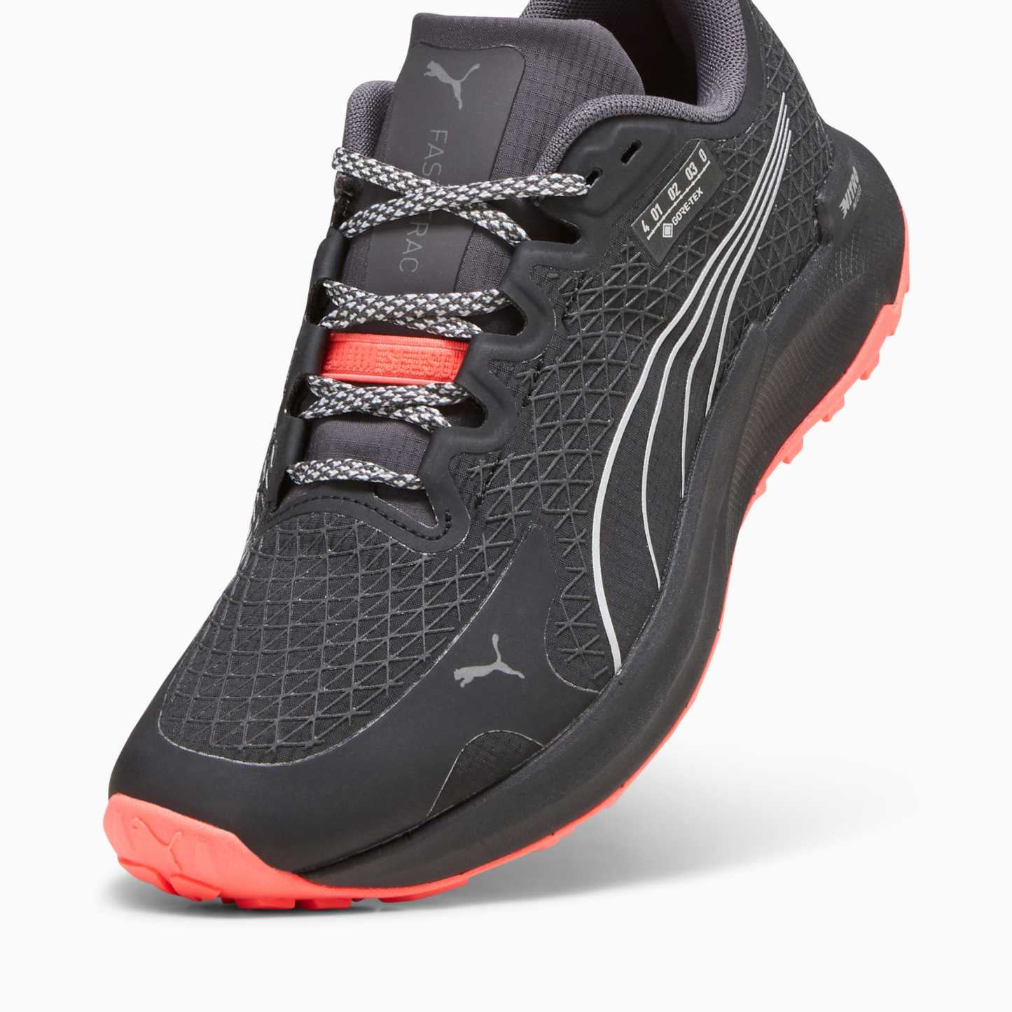 Featuring a GORE-TEX upper to keep water out while still offering extreme breathability, the FAST-TRAC NITRO GTX thrives in challenging conditions. A durable rubber pumthtaGRIP ATR outsole provides reliable multi-terrain traction—ideal for trail running, inclement weather, or both—while full-length NITRO foam is ultra-responsive and cushioned. The reflective silver-hue topographical map-inspired pattern and formstrip will light up your next adventure.- Style: 377063_04